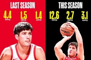 謝潑德本賽季場(chǎng)均12.6分2.7籃板3.1助攻1.6搶斷,三項(xiàng)命中率49.1/47.8/66.7%;
