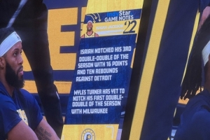 比賽首節(jié)主場(chǎng)展示以賽亞-杰克遜數(shù)據(jù)寫道:“以賽亞·杰克遜在對(duì)陣活塞時(shí)砍下16分10籃板,拿到賽季第三次兩雙,邁爾斯·特納在雄鹿還沒(méi)拿過(guò)兩雙?!?/p>