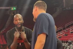 賽前,掘金球星約基奇在場邊和火箭老將杰夫·格林熱聊一波,雙方曾在掘金當(dāng)過隊友。