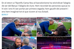 巴薩俱樂(lè)部主席拉波爾塔在社交媒體上寫道:“在重返坎普諾的這一天,巴薩球迷們重新找回了身為巴薩人的喜悅與快樂(lè)。”
