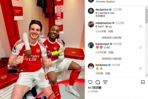 體育資訊11月24日訊 英超第12輪的北倫敦德比,阿森納以4-1的比分大勝熱刺。賽后,槍手中場(chǎng)賴斯在社交媒體上慶祝了這場(chǎng)重要的勝利。