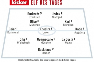 體育資訊11月24日訊 《踢球者》評選出本周德甲最佳陣,拜仁小將倫納特·卡爾首次入選。