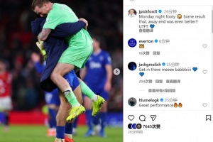 皮克福德社媒曬出慶祝的照片,配文:“周一足球之夜,這樣的結(jié)果太棒了,客場(chǎng)看臺(tái)的氛圍更是無(wú)敵,加油埃弗頓!”