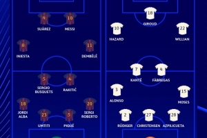 特爾施特根;阿爾巴、烏姆蒂蒂、皮克、羅貝托;布斯克茨、拉基蒂奇、伊涅斯塔、登貝萊;蘇亞雷斯、梅西
