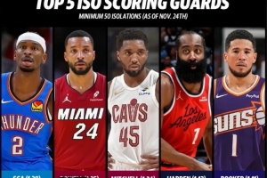 五人分別是:1、亞歷山大(每個單打回合得分 1.28分);2、鮑威爾 1.25分;3、米切爾 1.24分;4、哈登 1.12分;5、布克 1.11分。