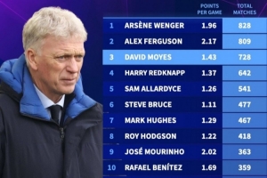 英超主帥執(zhí)教場(chǎng)次排名:莫耶斯728場(chǎng)第三,有望追上弗爵爺和溫格