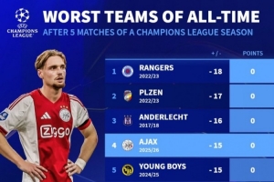 體育資訊11月26日訊 阿賈克斯在本輪歐冠不敵本菲卡,延續(xù)了本賽季至今的糟糕表現(xiàn),《轉(zhuǎn)會(huì)市場(chǎng)》統(tǒng)計(jì)顯示他們也是歐冠歷史前5輪同期戰(zhàn)績(jī)并列第4差。