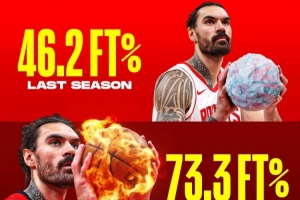 亞當(dāng)斯上賽季罰球命中率46.2%,本賽季73.3%,進步幅度58.66%(46.2%×58.66%+46.2%=73.3%);生涯罰球命中率為53.3%