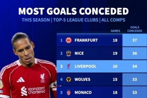 體育資訊11月27日訊 德國轉會市場統(tǒng)計了本賽季五大聯(lián)賽球隊的失球數量,并列出榜單,法蘭克福丟37球最多,利物浦丟34球第三。