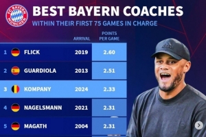拜仁主帥執(zhí)教前75場(chǎng)場(chǎng)均拿分榜: