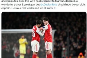 阿森納擁躉摩根在社媒曬出賴斯本場(chǎng)戴上隊(duì)長(zhǎng)袖標(biāo)的照片,寫道:“賴斯昨晚比賽中首次戴上阿森納隊(duì)長(zhǎng)袖標(biāo),盡管只有幾分鐘。我這么說并不是出于對(duì)厄德高的不敬,他也是一名出色的球員、很棒的伙計(jì),但是賴斯現(xiàn)在應(yīng)該成為球隊(duì)隊(duì)長(zhǎng)了,他是我們真正的領(lǐng)袖,這我們都知道的?!?/p>