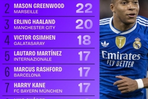 本賽季歐冠射門次數(shù)榜:姆巴佩居首,格林伍德次席,哈蘭德第三
