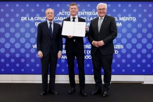 在伯納烏榮譽包廂舉行的儀式上,克羅斯被授予德國功績勛章騎士十字勛章。德國總統(tǒng)施泰因邁爾親自為這位皇馬傳奇和世界足壇巨星頒發(fā)了這一榮譽。出席授勛儀式的還有皇馬名譽主席何塞·馬丁內(nèi)斯·皮里、機構(gòu)關(guān)系總監(jiān)布特拉格諾、主帥阿隆索、球員巴爾韋德、呂迪格,以及皇馬傳奇球員羅伯托·卡洛斯、阿韋羅亞和索拉里。