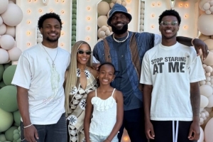 湖人前鋒詹姆斯的小兒子布萊斯更新Instagram Story,曬出一張詹姆斯全家五口人的合影,并寫道:“感恩??”