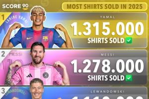 體育資訊11月28日訊 Score 90援引Euromericas Sport Marketing數(shù)據(jù),統(tǒng)計(jì)了2025年截至目前世界足壇的球員球衣銷量榜,亞馬爾以131.5萬件排名第一,梅西第二,C羅位列第七。