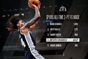 瓦塞爾迎來里程碑,他的三分命中數(shù)來到662記,超越布魯斯·鮑文升至隊史第四。