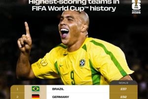 巴德斷檔前二!世界杯球隊(duì)總進(jìn)球榜:巴西237球居首 德國(guó)232球第2
