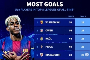 五大聯(lián)賽歷史U19進球榜:歐文、勞爾、姆巴佩在列,亞馬爾暫列第9