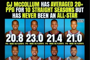 CJ在個人最近的連續(xù)10個賽季中場均得分20+,但卻從來沒有進入過全明星,而同期達成此成就的僅有7人:詹姆斯、庫里、歐文、濃眉、德羅贊、杜蘭特、利拉德。
