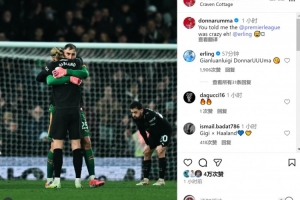 曼城門將多納魯馬社媒曬出與哈蘭德?lián)肀У恼掌?,配文:“你早就告訴過我英超很瘋狂,是吧!??”