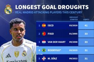 據德轉統(tǒng)計,羅德里戈31場球荒場數在本世紀皇馬進攻球員上可以排到第4位,僅次于伊斯科、菲戈和范德法特的球荒場數。