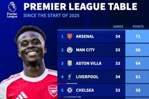 體育資訊12月5日訊 《轉會市場》統(tǒng)計了2025年英超總積分情況,阿森納多賽1場力壓曼城居首。