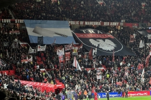 在死忠看臺(tái),一眾曼聯(lián)球迷打出大幅tifo表達(dá)對(duì)利馬的支持,將阿根廷國(guó)旗里的太陽替換為了菜刀…
