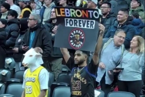 賽前有身穿詹姆斯球衣的球迷打出了“永遠(yuǎn)的勒布倫多(LeBronto,勒布朗和多倫多組合的諧音寓意詹姆斯生涯對(duì)猛龍的統(tǒng)治力)”的標(biāo)語,另一位詹姆斯球迷則戴上了山羊頭套。
