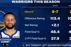 轉(zhuǎn)播方給出一組數(shù)據(jù),本賽季庫里在場時勇士9勝7負(fù),進攻效率113.4,凈效率+2.1,投籃命中率46.4%,三分命中率37.9%;