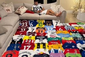 體育資訊12月5日訊 紐卡斯?fàn)栔袌黾R良斯今天在Instagram發(fā)照片,曬出了自己的球衣收藏。