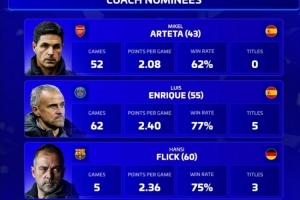 德轉(zhuǎn)2025年最佳教練候選:阿爾特塔、恩里克、弗里克、孔帕尼