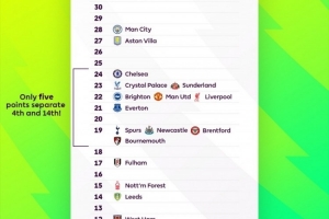 英超官方曬出積分榜,第4名切爾西與第14名伯恩茅斯之間只相差5分,積分榜中上游球隊的積分非常接近。