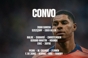 體育資訊12月6日訊 北京時(shí)間明天凌晨1點(diǎn)30分,巴薩將在西甲第15輪比賽中客場對陣貝蒂斯,巴薩公布了此役的球員名單,費(fèi)爾明、德容回歸,奧爾莫、阿勞霍、加維缺席。