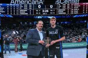 體育資訊12月7日訊 獨行俠主場迎戰(zhàn)火箭,狀元弗拉格賽前領取月最佳新秀獎。