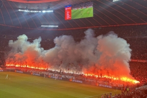 體育資訊12月10日訊 拜仁在本輪歐冠對(duì)陣葡體,南看臺(tái)死忠在比賽中燃放焰火。
