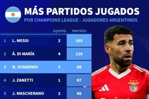 體育資訊12月12日訊 德國轉會市場統(tǒng)計了阿根廷球員的歐冠出場次數,并列出榜單,梅西、迪馬利亞前兩名,奧塔門迪升至第三位。