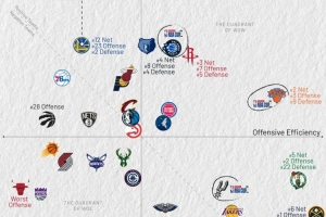 橫軸代表進攻效率,越靠右越好,縱軸代表防守效率,越靠上越強。第一象限的球隊多為發(fā)揮出色的球隊,而在第三象限的球隊通常為戰(zhàn)績比較糟糕的球隊。