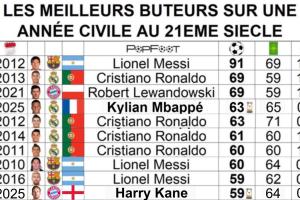 在21世紀(jì)自然年進(jìn)球榜上,姆巴佩63球的成績(jī)已經(jīng)超越2012年的C羅來到第4。在2025年皇馬僅剩2場(chǎng)比賽,想達(dá)到2013年C羅、2021年萊萬的69球已經(jīng)幾乎不可能。在這份榜單的榜首,2012年梅西的91球仍遙不可及。