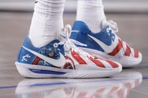 本場(chǎng)比賽,康寧漢姆穿上了客制版本的Nike GT Cut 3 PE,在美國(guó)隊(duì)長(zhǎng)主題基礎(chǔ)上,將個(gè)人Logo融入到了美隊(duì)的形象當(dāng)中。