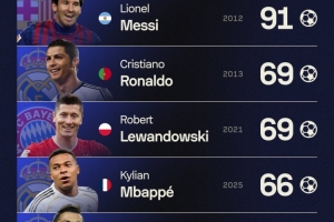 據(jù)Sofascore統(tǒng)計,姆巴佩2025年俱樂部+國家隊總計打進66球,本世紀自然年進球第四多。