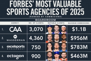 體育資訊12月21日訊 美媒Boardroom報道,根據(jù)福布斯的數(shù)據(jù),體育經(jīng)紀公司CAA仍然穩(wěn)居行業(yè)領(lǐng)先地位,他們管理著超過200億美元的合同。它在福布斯2025年榜單上以11億美元的傭金位列榜首,自2022年以來增長了18%,管理著超過3000名體育及代言客戶。