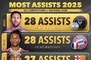 以下是2025年年度助攻榜單(俱樂部+國(guó)家隊(duì)各項(xiàng)賽事):