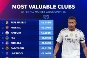 體育資訊12月27日訊 德國轉(zhuǎn)會(huì)市場(chǎng)更新了各大聯(lián)賽的球員身價(jià),并列出俱樂部身價(jià)最新排名,皇馬13.8億歐居首,阿森納、曼城、巴黎前四。