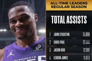 比賽開局3分鐘,威少送出2次助攻,職業(yè)生涯助攻次數(shù)達到10142次,超越魔術師約翰遜獨占歷史第七!