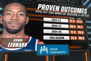 萊昂納德近四個賽季賽季500分鐘之前和之后場均得分對比: