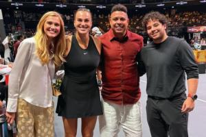 本場(chǎng)比賽,大羅和妻子塞琳娜現(xiàn)場(chǎng)觀戰(zhàn)比賽,大羅與薩巴倫卡、克耶高斯合影。