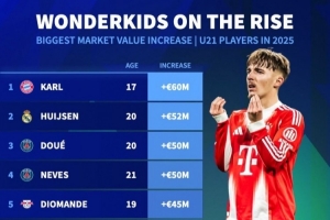 體育資訊1月4日訊 《轉(zhuǎn)會(huì)市場(chǎng)》統(tǒng)計(jì)了2025年U21球員的身價(jià)上漲幅度情況,拜仁小將卡爾位居榜首。