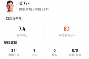 體育資訊1月4日訊 巴薩在本輪西甲對陣西班牙人,萊萬本場數(shù)據(jù)如下: