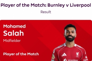 本場比賽薩拉赫在補(bǔ)時(shí)階段打進(jìn)點(diǎn)球絕殺,賽后也當(dāng)選英超官方球迷票選全場最佳球員。