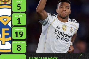姆巴佩在9月的4場(chǎng)西甲打進(jìn)5球,助攻1次。期間完成19次成功過(guò)人,8次射正目標(biāo)。Whoscored評(píng)分達(dá)到了8.53分。